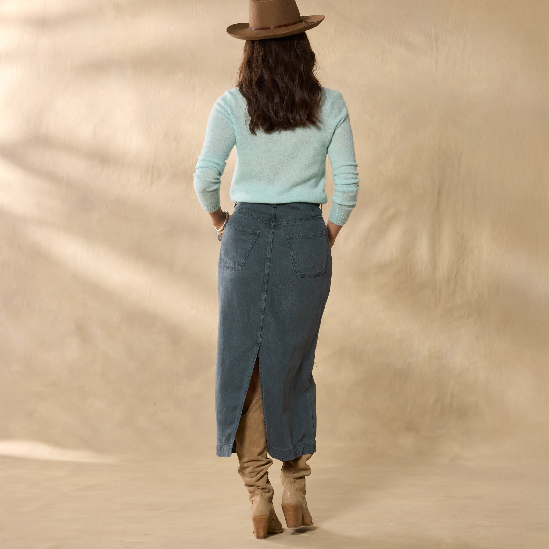 An instant everyday staple. our Bosque Skirt features an ultra-wearable midi length with a button fly. front patch pockets and a back slit. Tencel/linen/cotton. Machine wash. Imported. Exclusive. Sizes 24?C32. Approx. 32.5l.