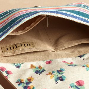This handcrafted. geometric woven shoulder bag features a contrasting inner flap. pom tassel. magnetic closure. two slot pockets and one zipper pocket. Cotton. Made in USA. Approx. 11w x 1.5d x 7h.