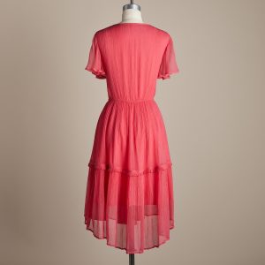 There’s so much beautiful movement in our embroidered dress with dramatic. overlaying tiers. V-neck and ties. ruffled neckline and covered eyelet buttons. Fully lined. Cupro. Hand wash. Imported. Exclusive. Sizes XS (0 to 2). S (4 to 6). M (8 to 10). L (12 to 14). XL (16 to 18). XXL (20 to 22). Approx. 54-1/2L.