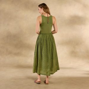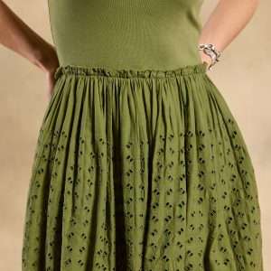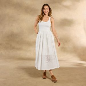 Soon to be your go-to casual fit. our easy popover tank dress is detailed with mixed rib. woven eyelet and raw edge ruffles at the waistline. Side seam pockets. lined skirt. Cotton. Machine wash. Imported. Exclusive. Sizes XXS (00). XS (0?C2). S (4?C6). M (8?C10). L (12?C14). XL (16?C18). Approx. 49l.