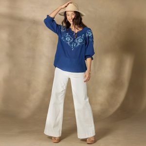 Light. airy and easygoing. our Junco Floral Top features a smocked notch neckline and cuffs with ruffle trim. subtle high-low hem and tonal embroidery on the bodice and sleeves. Cotton/poly. Machine wash. cold. Imported. Exclusive. Sizes XS (0?C2). S (4?C6). M (8?C10). L (12?C14). XL (16?C18). XXL (20?C22).