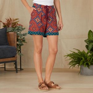 Inspired by Japanese gardens and woodcut designs. these charming shorts feature a nicely weighted linen and cotton in complementary patterns. four pockets and zipper fly with braided. tassel ties and cuffed hems. Machine wash. Imported. Exclusive. Sizes XXS (00). XS (0 to 2). S (4 to 6). M (8 to 10). L (12 to 14). XL (16 to 18). Inseam 4-3/4 rolled. 6 unrolled.