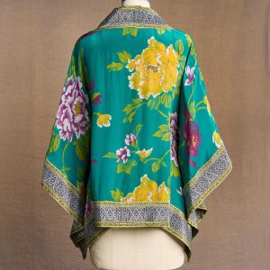 Lovely. vintage inspired floral prints set the stage on our airy. lightweight open front kimono with eye-catching border print. Viscose. Machine wash. Imported. Exclusive. Sizes XS. S/M. L/XL. Approx. 24l.