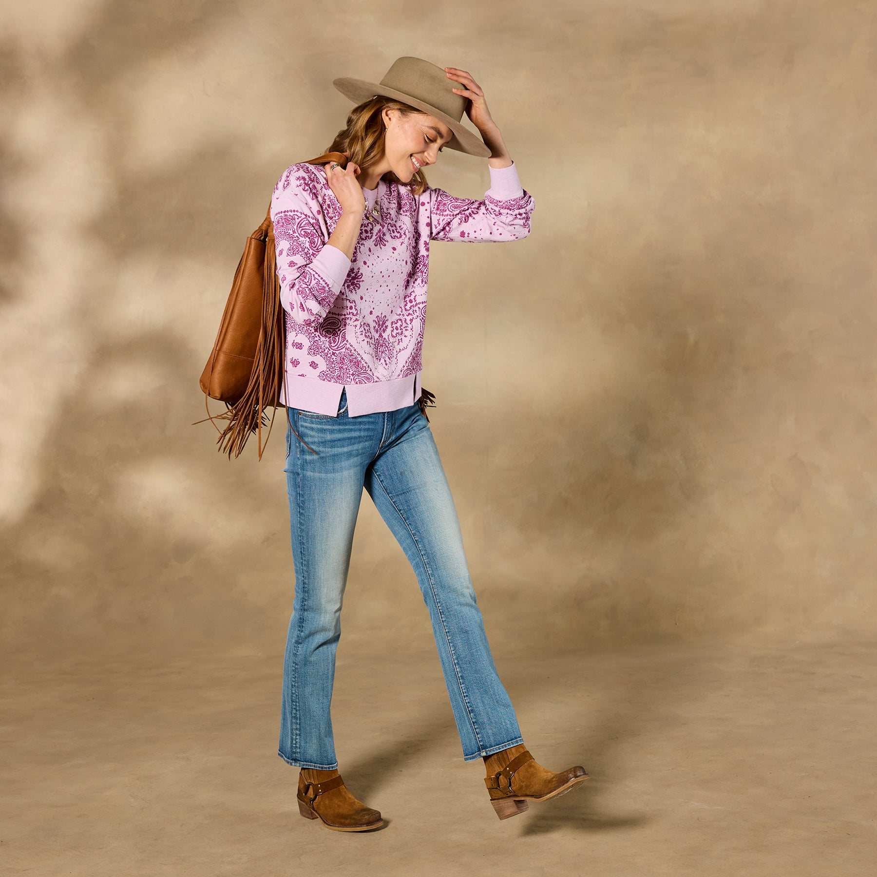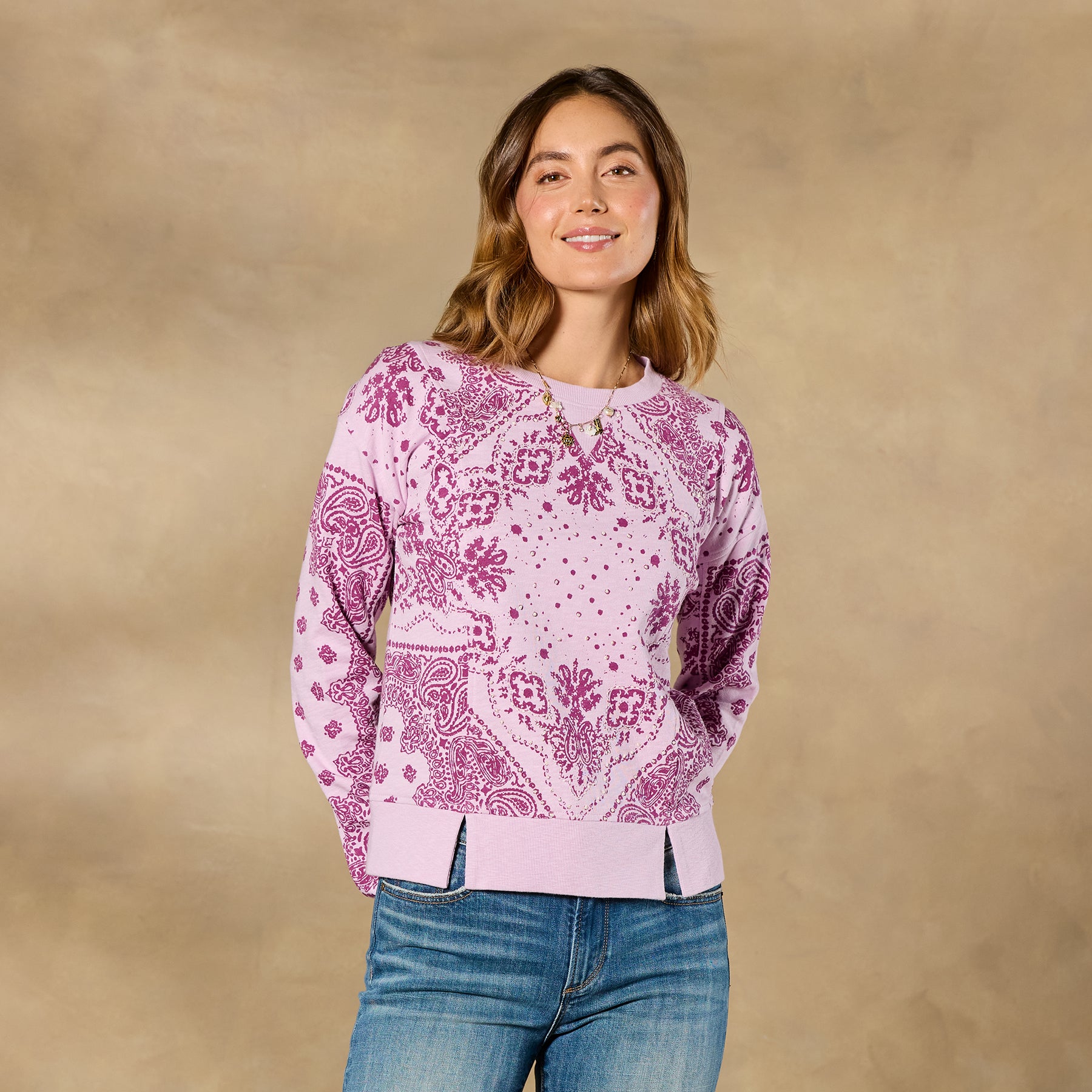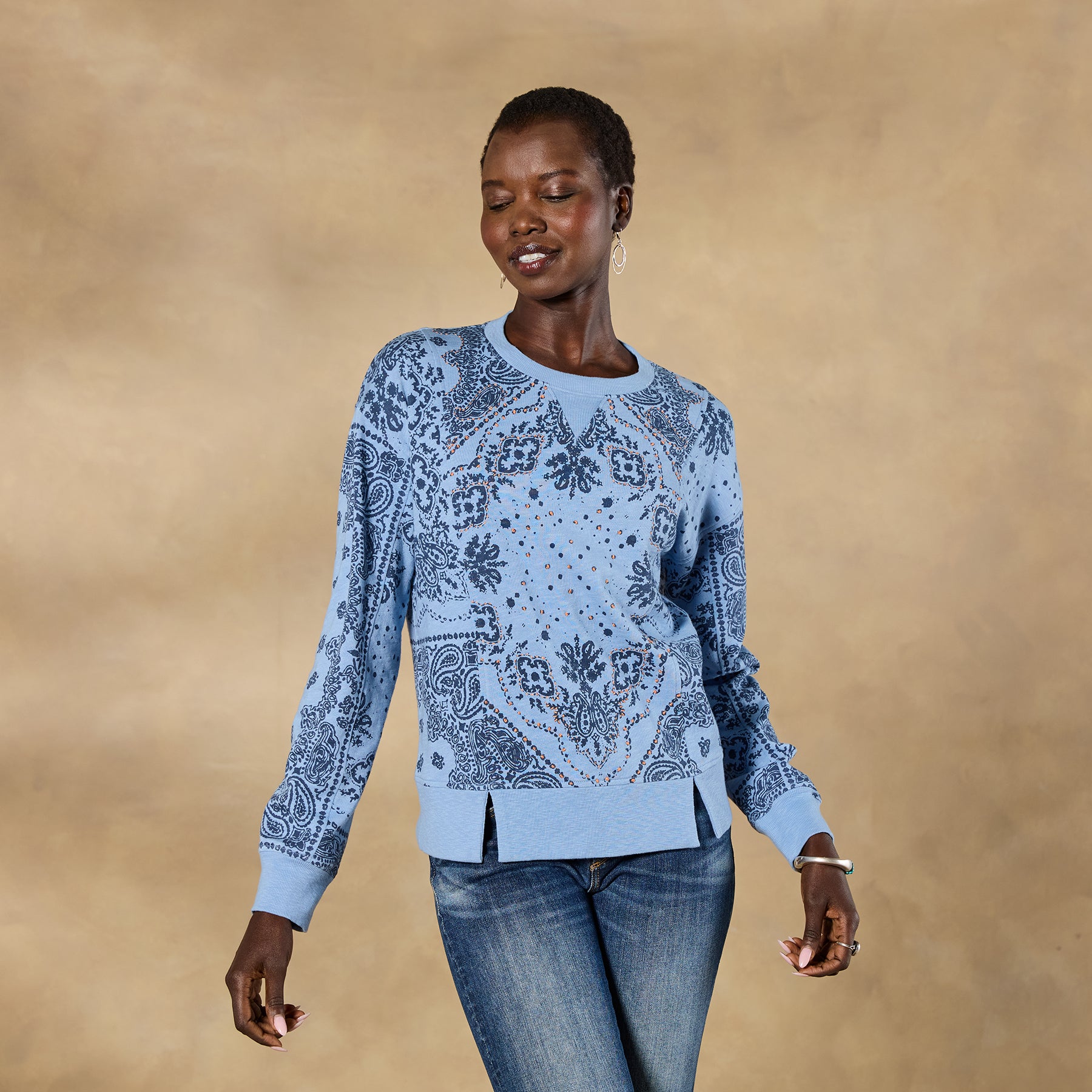 Our Maebelle Sweatshirt celebrates Western spirit with its charming bandana print. scattered embroidery. drop-shoulder silhouette and seam details. Cotton. Machine wash. Imported. Exclusive. Sizes XS (0–2). S (4–6). M (8–10). L (12–14). XL (16–18). XXL (20–22). Approx. 20l.