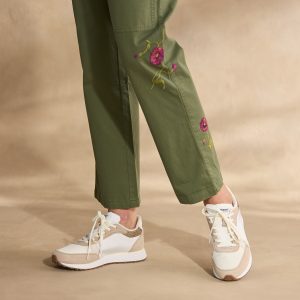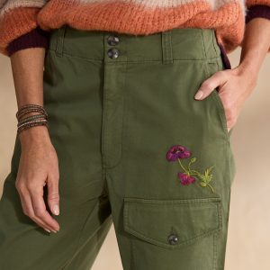 Overflowing with beautiful detail. our asymmetrical floral embroidered cargo pants feature a flattering Hollywood waist with two buttons. five pockets and a straight leg fit. Cotton/lycra. Machine wash. Imported. Exclusive. Sizes 2–16. 26.5 inseam.