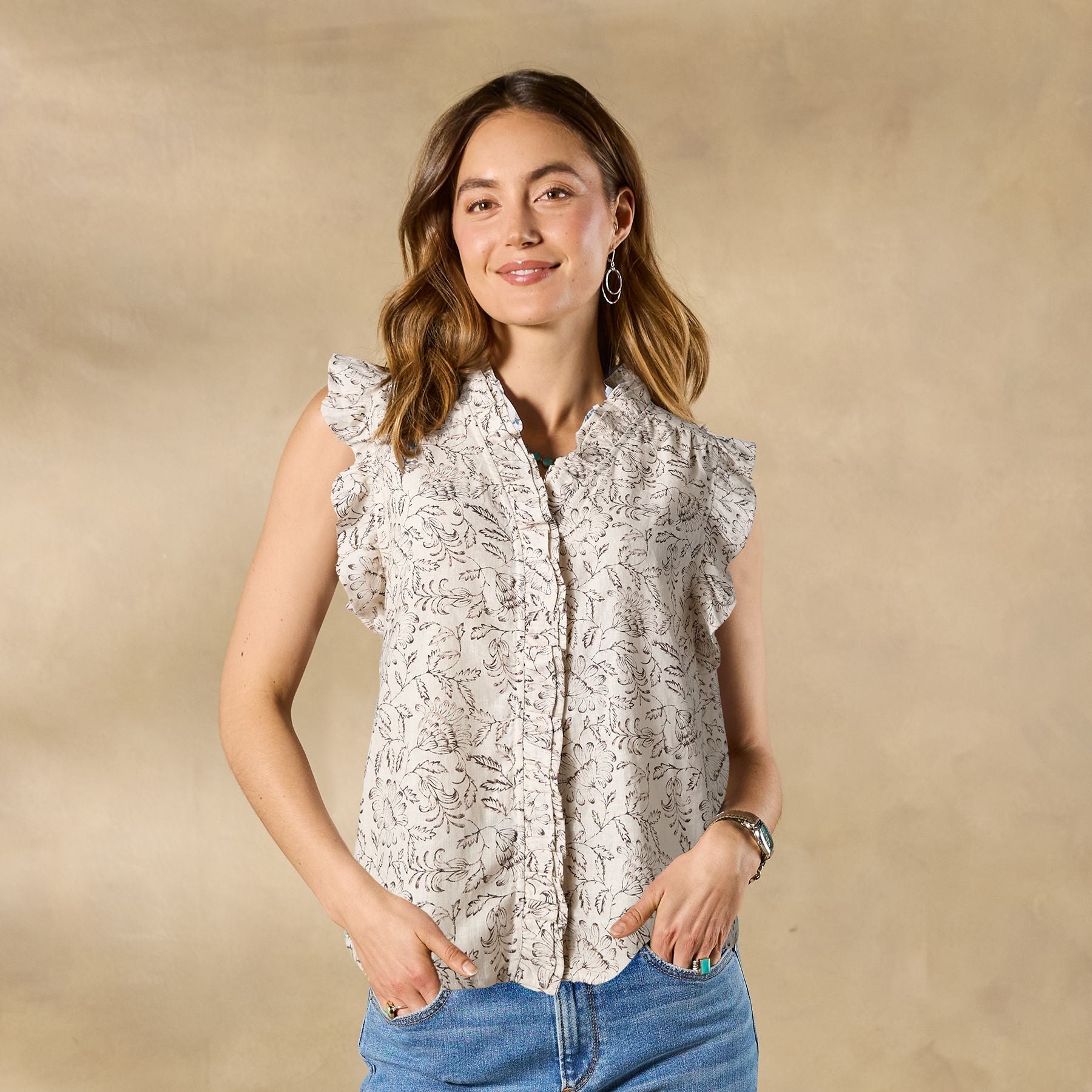 A Sundance fan fave. now in a subtle neutral floral print! Ruffle details at sleeve and bodice; hidden-button placket. Cotton. Machine wash. Imported. Sizes XS (0?C2). S (4?C6). M (8?C10). L (12?C14). XL (16?C18). XXL (20?C22). Approx. 24.75l.