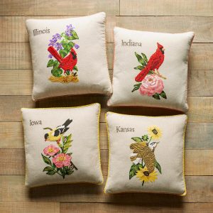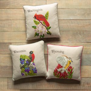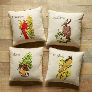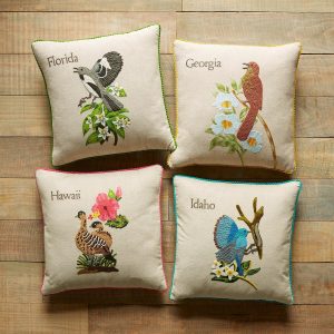 Celebrate the states you love to visit or the states you’ve called home with our exclusive decorative pillows hand knotted. textured and embroidered in vibrant. colorful detail. Each pillow features the iconic 1982 American stamp design with the bird and flower from each state proudly represented. Linen. Imported. 18 sq.