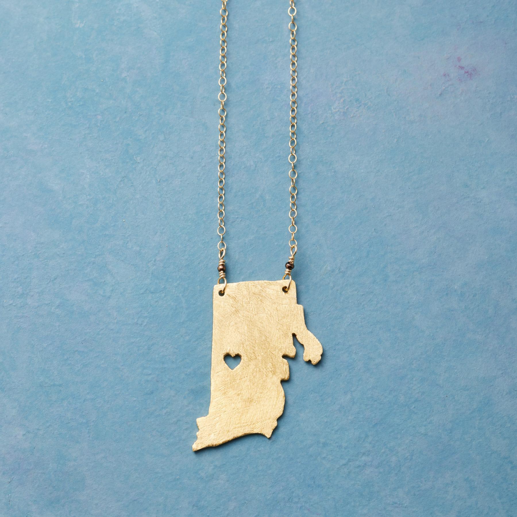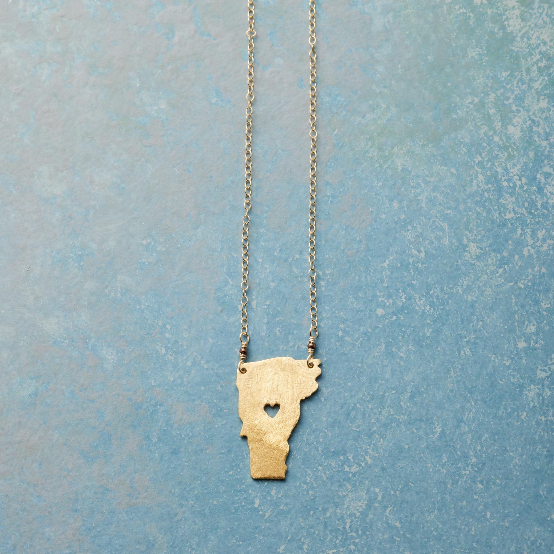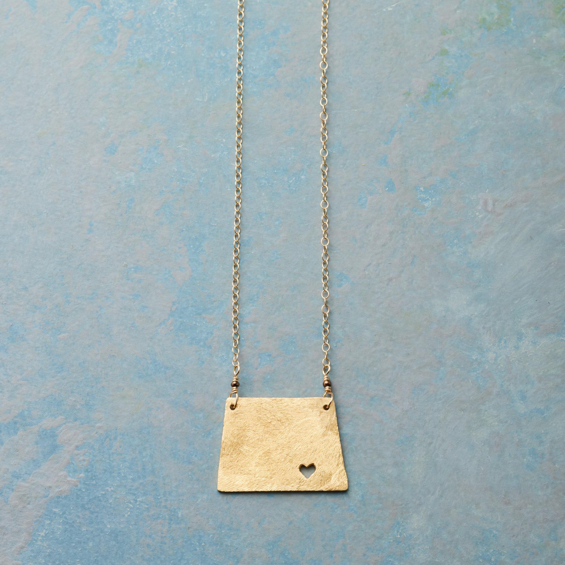 Celebrate your favorite state with our 18kt gold-plated charm strung on a 14kt gold-filled chain. A cut-out heart shows your love. Lobster clasp. Handcrafted. Exclusive. 17-18l