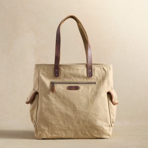 Stay stylish and organized with this on-trend. washed canvas tote featuring a fun. latch closure. front pocket and side. buckle-snap pockets. Finished with leather handles and trim. Zipper closure. Cotton lined with one zipper pocket and two slot pockets. Imported. Exclusive. Approx. 15w x 5d x 15.5h.